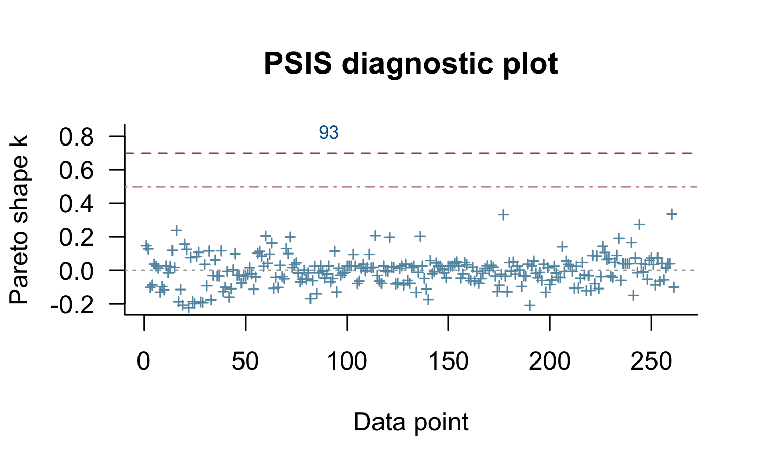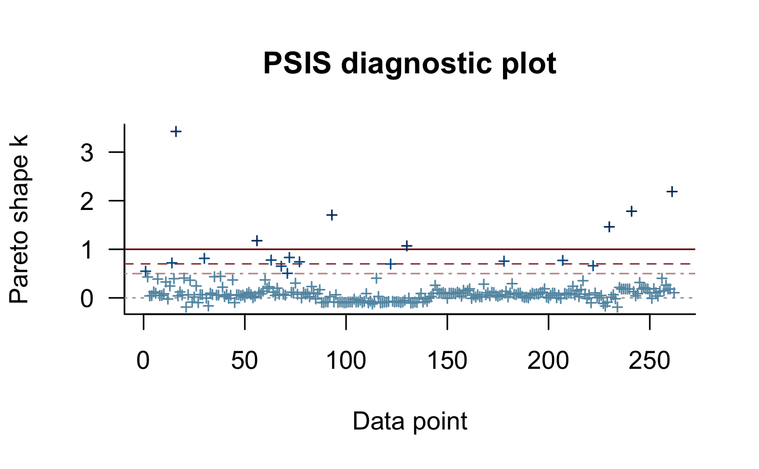 if (any(pareto_k_values(loo2) > 0.7)) { loo2 <- loo(fit2, save_psis = TRUE, k_threshold = 0.7) }