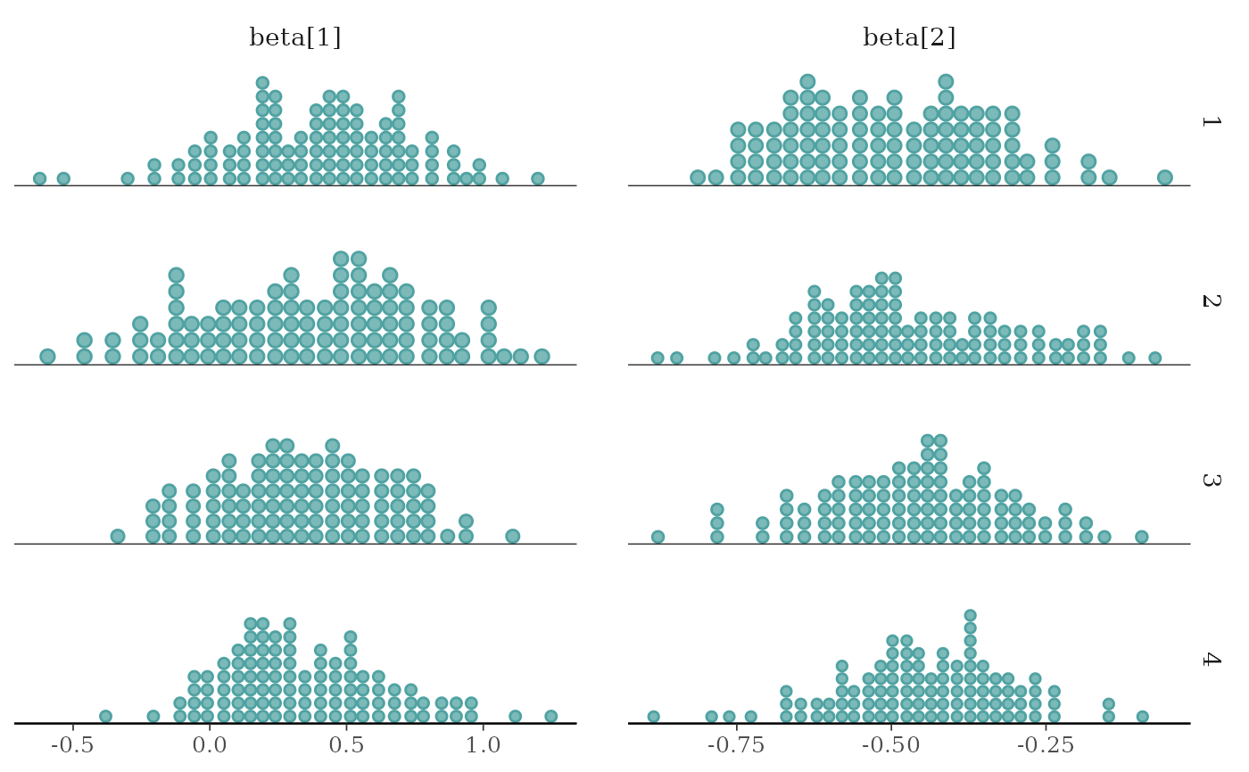 mcmc_dots_by_chain(x, regex_pars = "beta", facet_args = list(labeller = chain_labeller))