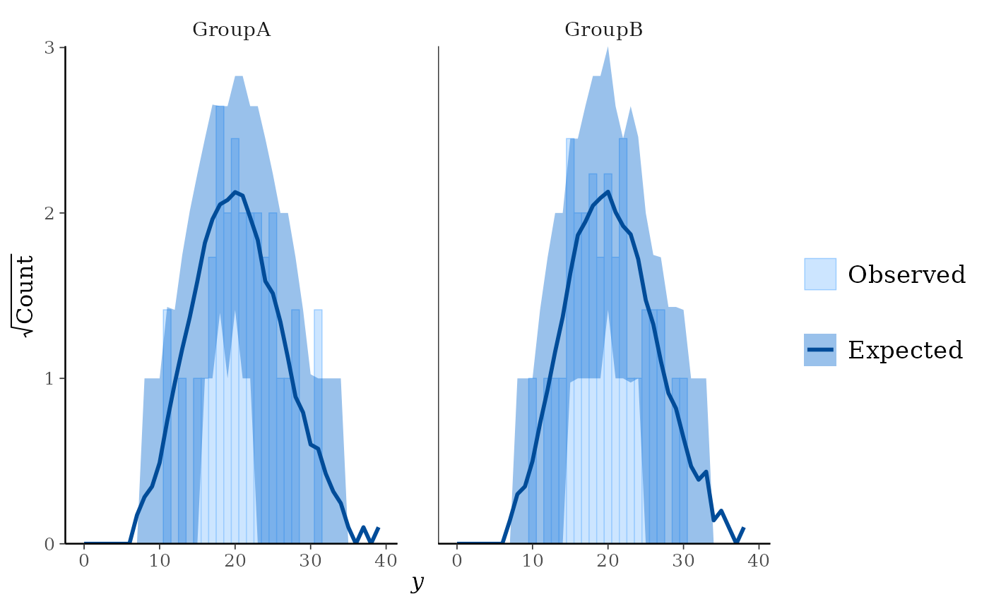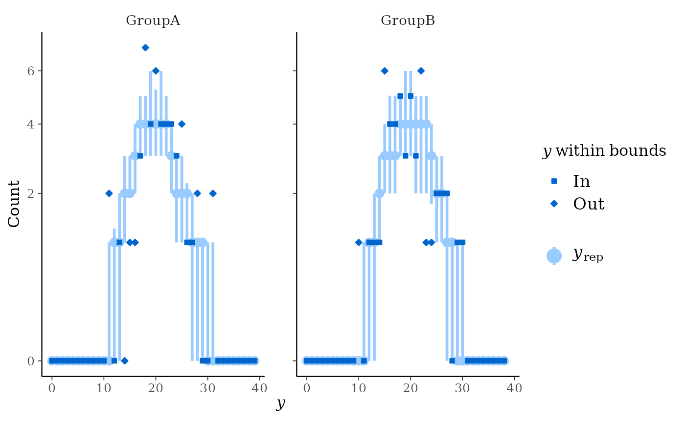 ppc_rootogram(style = "discrete)andppc_rootogram_grouped(style = "discrete), ifTRUEthen the observed counts will be plotted with different shapes depending on whether they are within the bounds of theyquantiles.