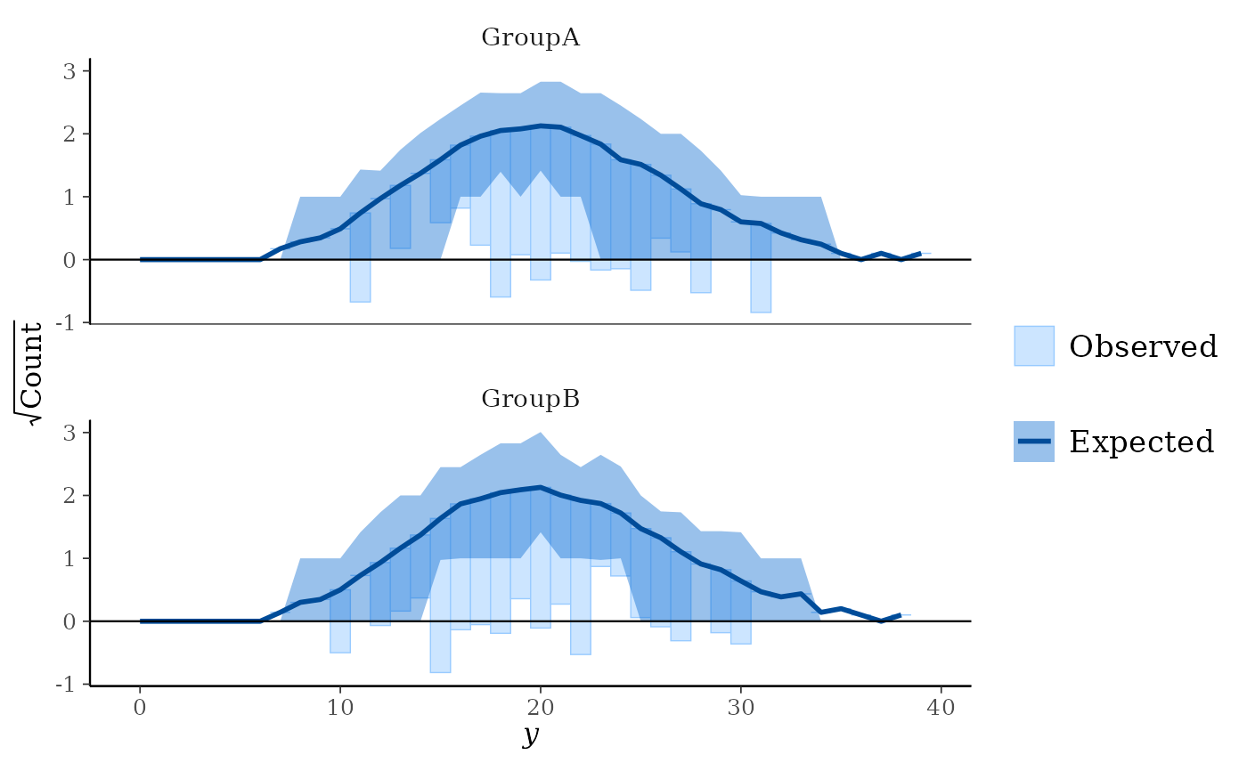 ppc_bars()andppc_bars_grouped(). Users can callppc_bars_data()directly to obtain the prepared data frame and create custom visualizations with ggplot2.ppc_rootogram()Rootograms allow for diagnosing problems in count data models such as overdispersion or excess zeros. In