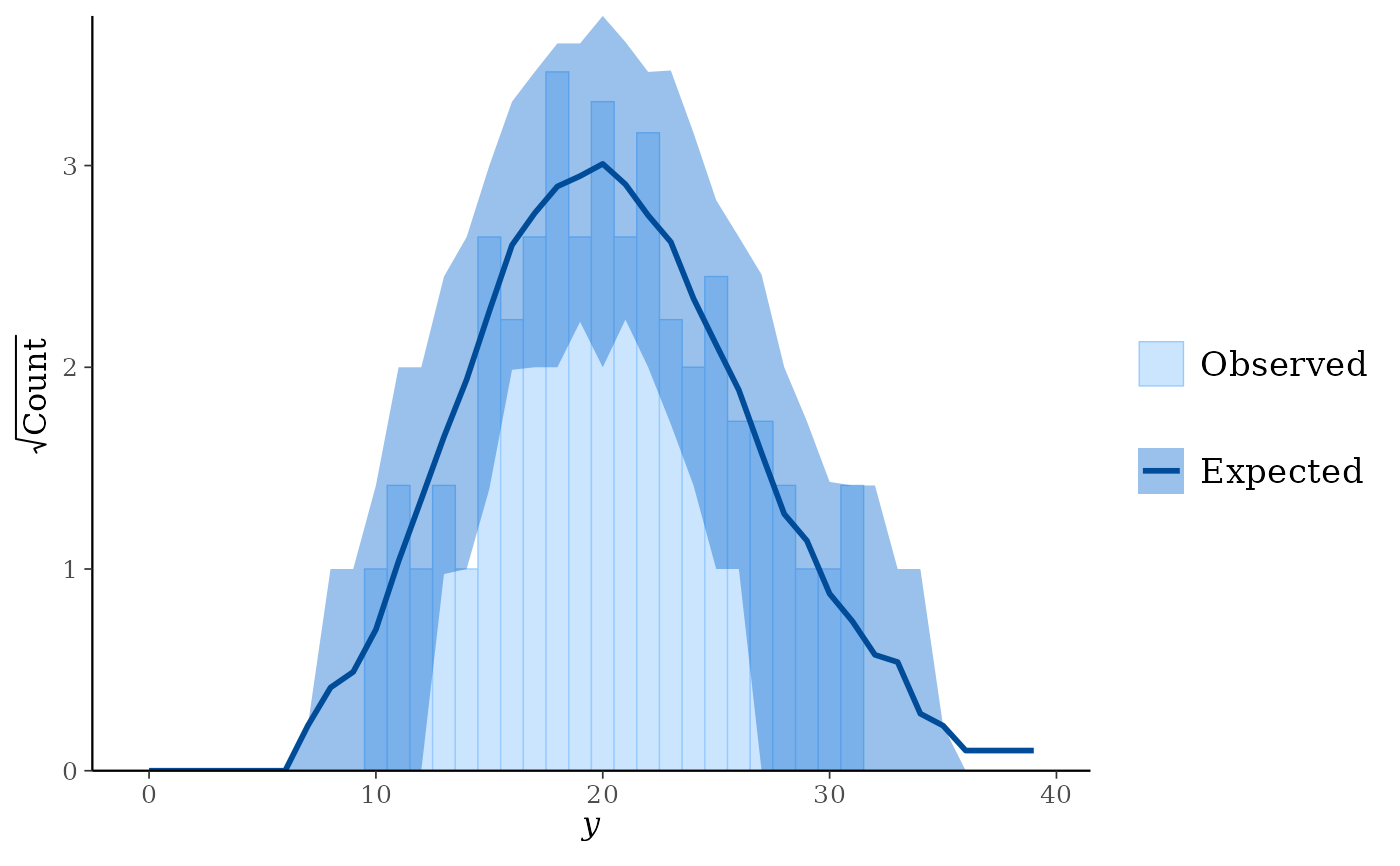 ppc_bars()but a separate plot (facet) is generated for each level of a grouping variable.ppc_rootogram()Rootograms allow for diagnosing problems in count data models such as overdispersion or excess zeros. In