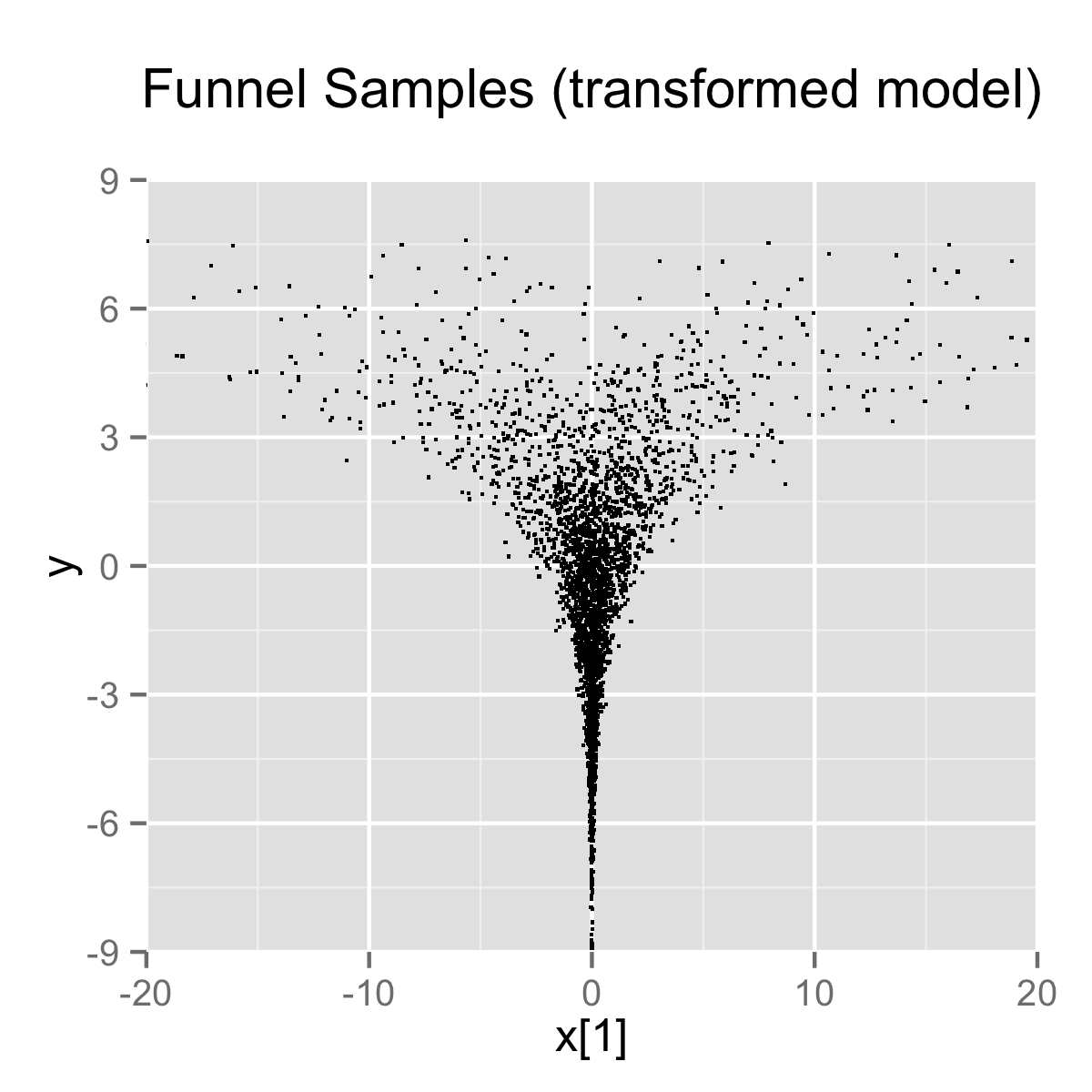 }In this second model, the parameters x_raw and y_raw are sampled as independent standard normals, which is easy for Stan. These are then transformed into draws from the funnel. In this case, the same transform may be used to define Monte Carlo directly based on independent standard normal draws; Markov chain Monte Carlo methods are not necessary. If such a reparameterization were used in Stan code, it is useful to provide a comment indicating what the distribution for the parameter implies for the distribution of the transformed parameter.