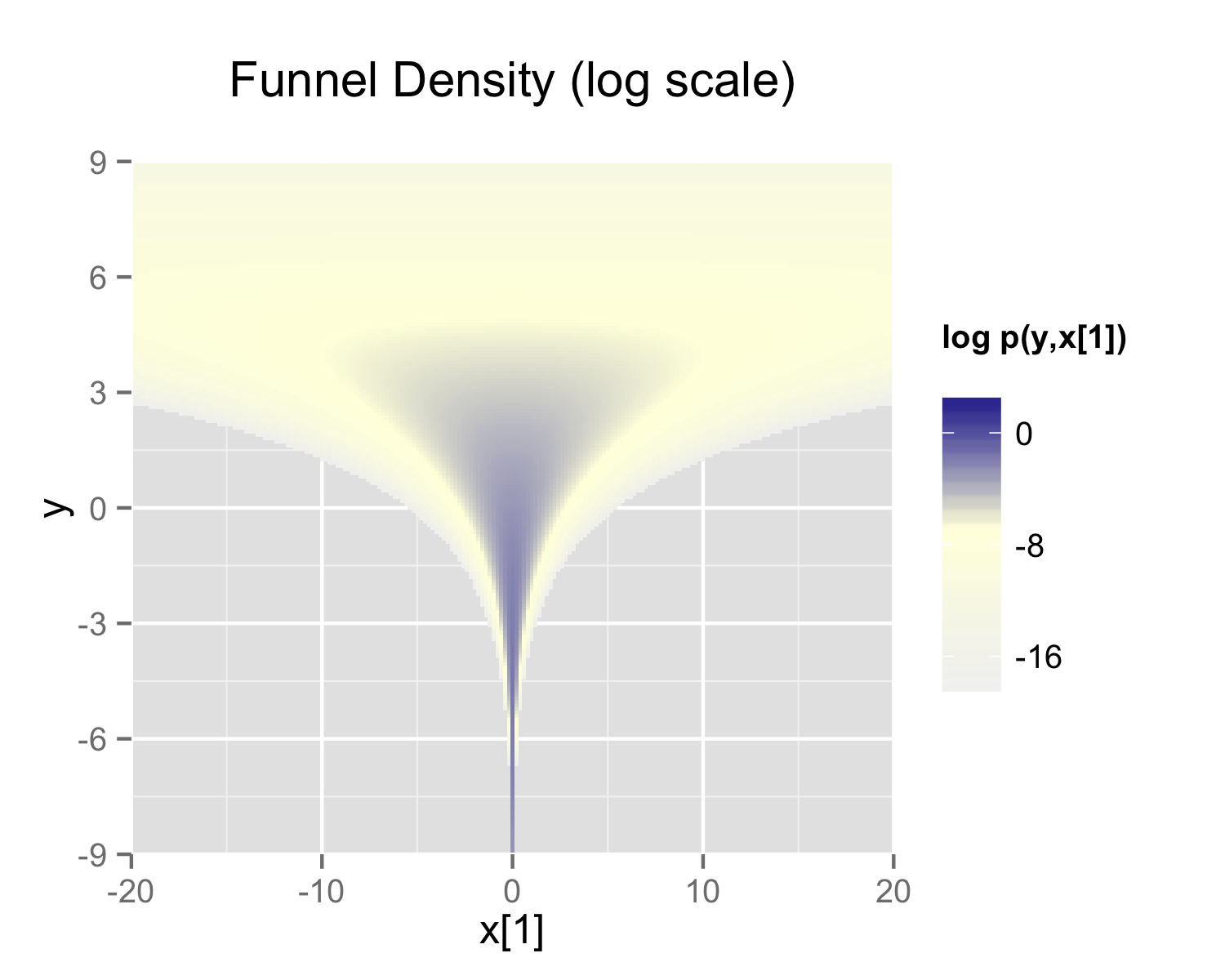 Neal (2003) defines a distribution that exemplifies the difficulties of sampling from some hierarchical models. Neal’s example is fairly extreme, but can be trivially reparameterized in such a way as to make sampling straightforward. Neal’s example has support for \(y \in \mathbb{R}\) and \(x \in \mathbb{R}^9\) with density