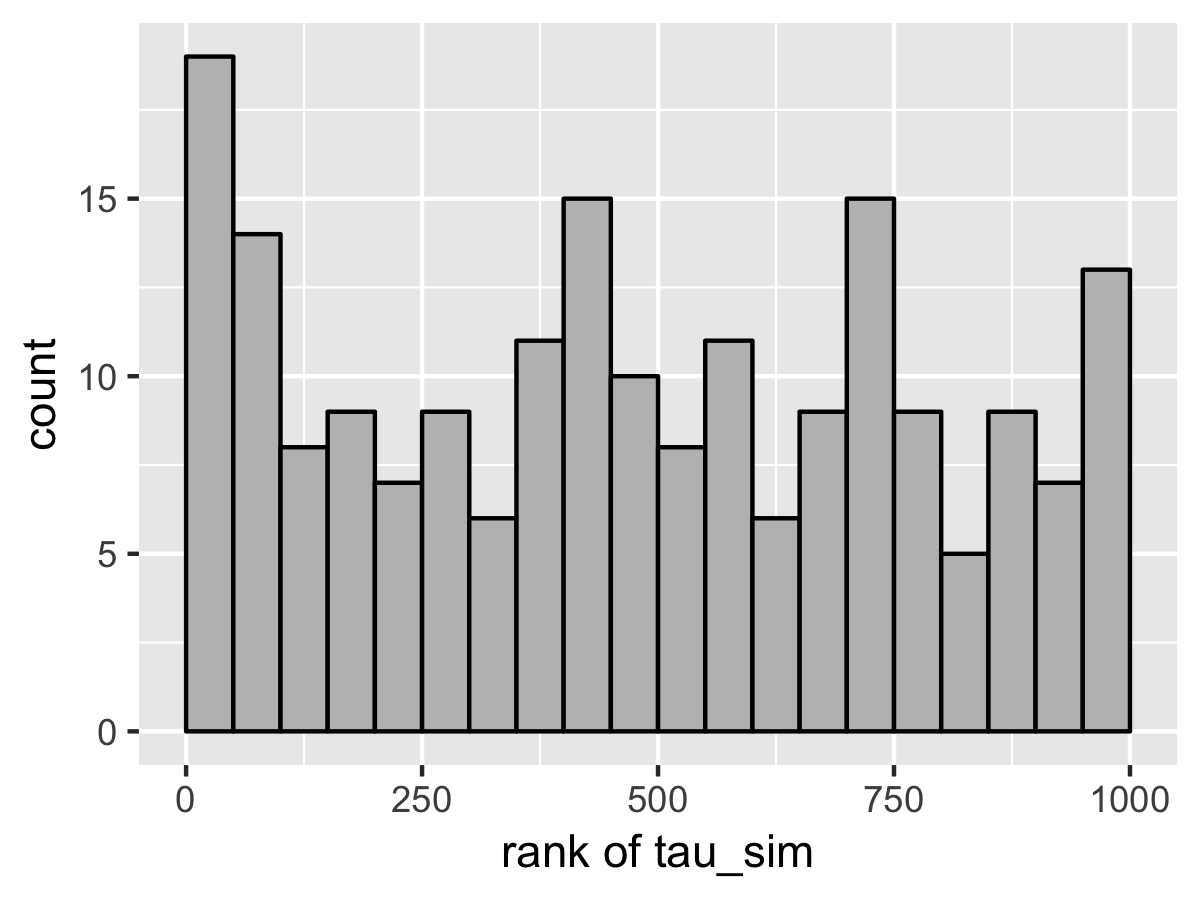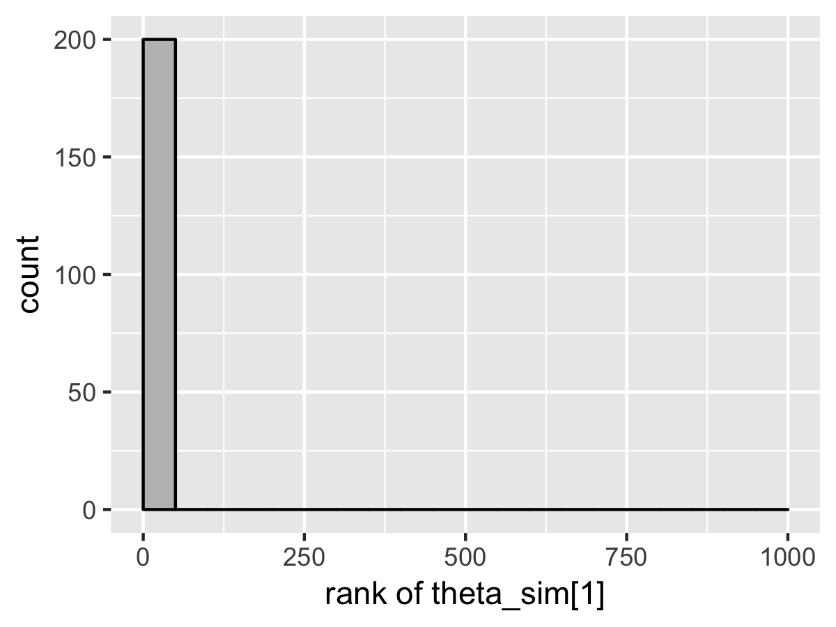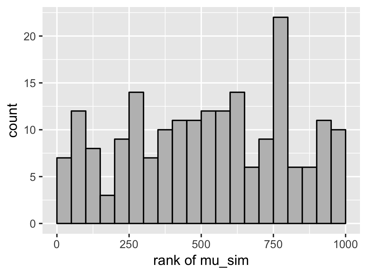 }After running this for enough iterations so that the effective sample size is larger than \(M\), then thinning to \(M\) draws (here \(M = 999\)), the ranks are computed and binned, and then plotted.