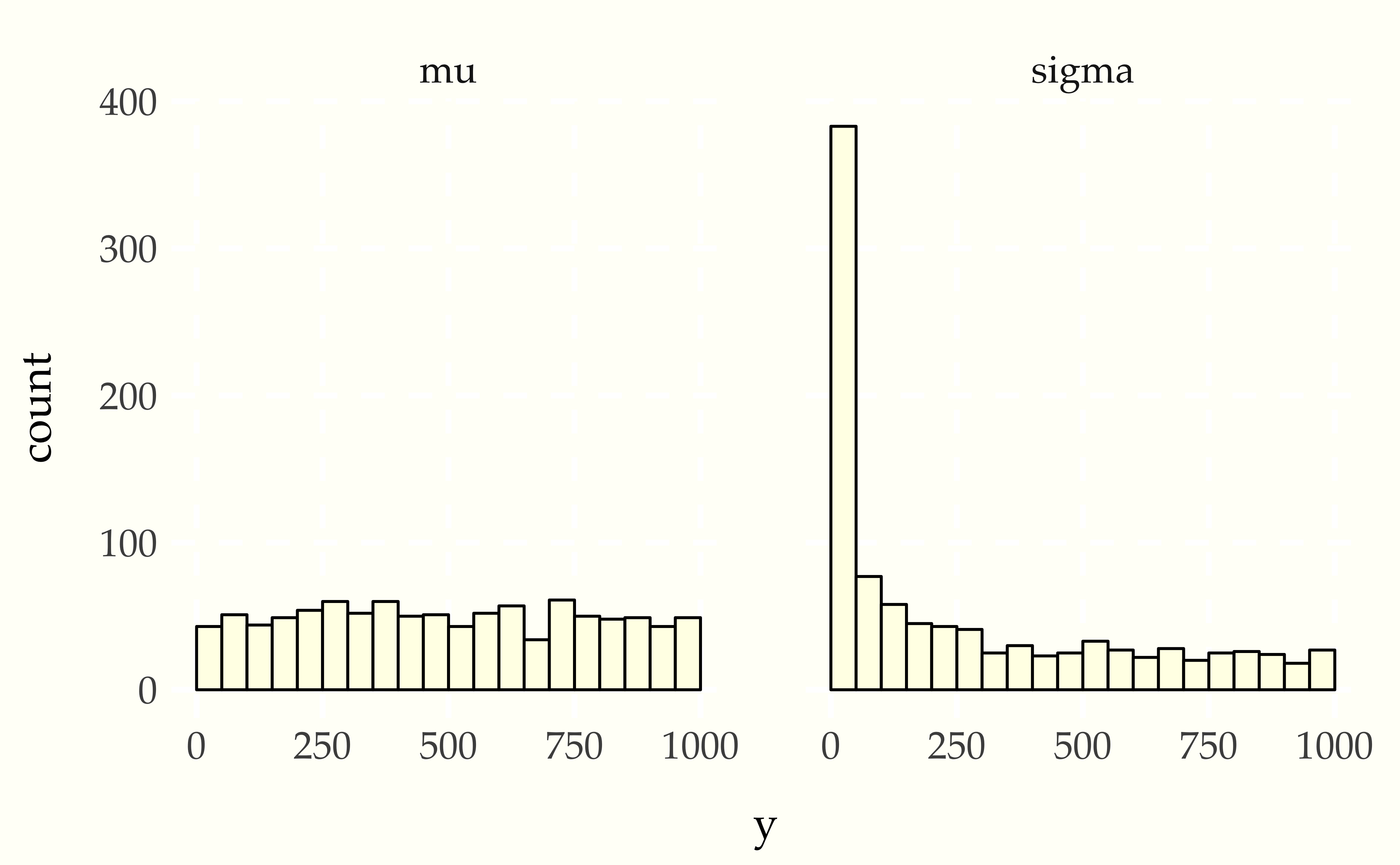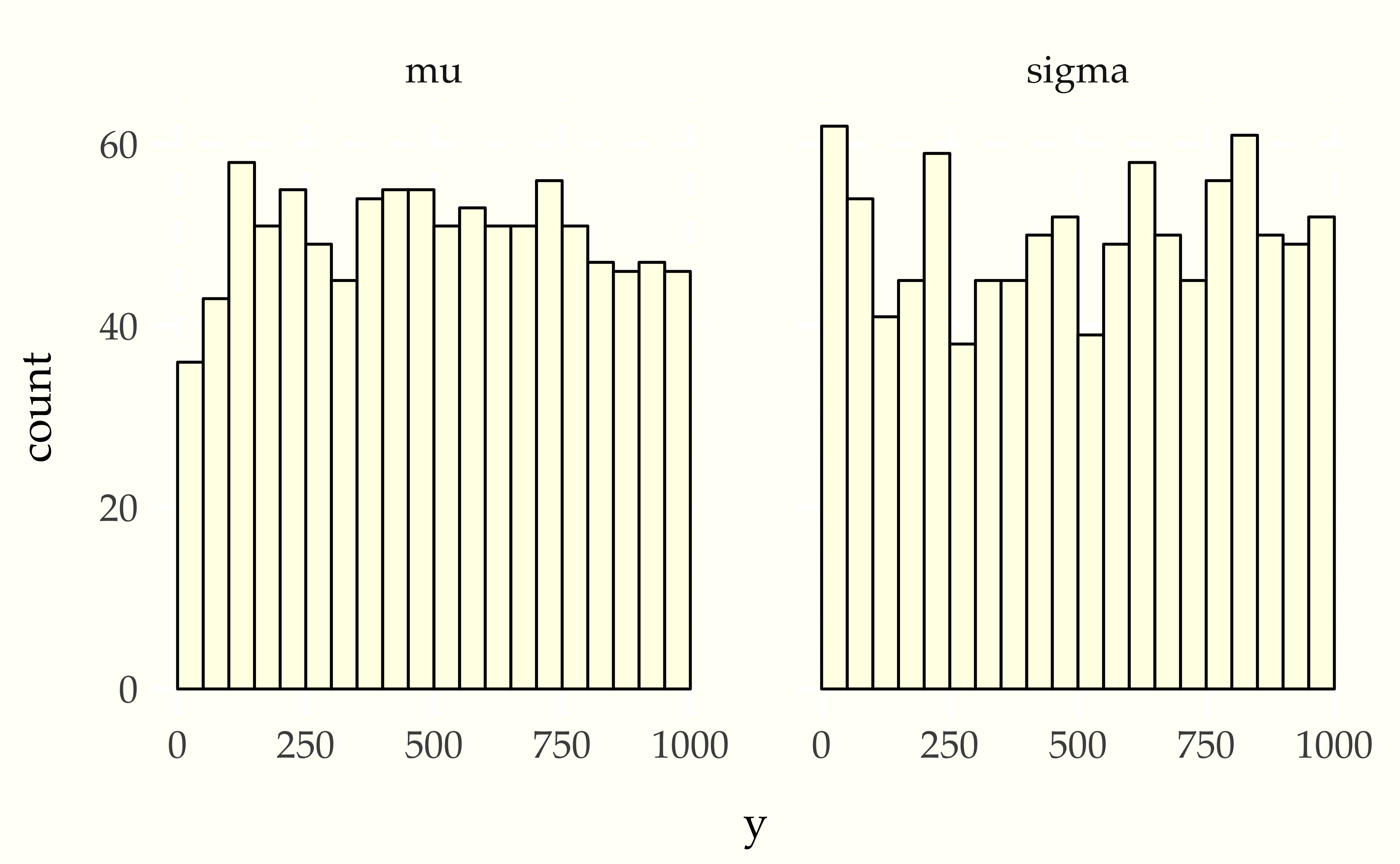 For example, suppose the following two parameter values are drawn from the prior in the first simulation, \[ (\mu^{\textrm{sim(1)}}, \sigma^{\textrm{sim(1)}}) = (1.01, 0.23). \] Then data \(y^{\textrm{sim}(1)} \sim p(y \mid \mu^{\textrm{sim(1)}}, \sigma^{\textrm{sim(1)}})\) is drawn according to the sampling distribution. Next, \(M = 4\) draws are taken from the posterior \(\mu^{(1,m)}, \sigma^{(1,m)} \sim p(\mu, \sigma \mid y^{\textrm{sim}(1)})\), \[ \begin{array}{r|rr} m & \mu^{(1,m)} & \sigma^{(1,m)} \\ \hline 1 & 1.07 & 0.33 \\ 2 & -0.32 & 0.14 \\ 3 & -0.99 & 0.26 \\ 4 & 1.51 & 0.31 \end{array} \] Then the comparisons on which ranks are based look as follows, \[ \begin{array}{r|cc} m & \textrm{I}(\mu^{(1,m)} < \mu^{\textrm{sim}(1)}) & \textrm{I}(\sigma^{(1,m)} < \sigma^{\textrm{sim}(1)}) \\ \hline 1 & 0 & 0 \\ 2 & 1 & 1 \\ 3 & 1 & 0 \\ 4 & 0 & 0 \end{array} \] The ranks are the column sums, \(r_{1,1} = 2\) and \(r_{1,2} = 1\). Because the simulated parameters are distributed according to the posterior, these ranks should be distributed uniformly between \(0\) and \(M\), the number of posterior draws.